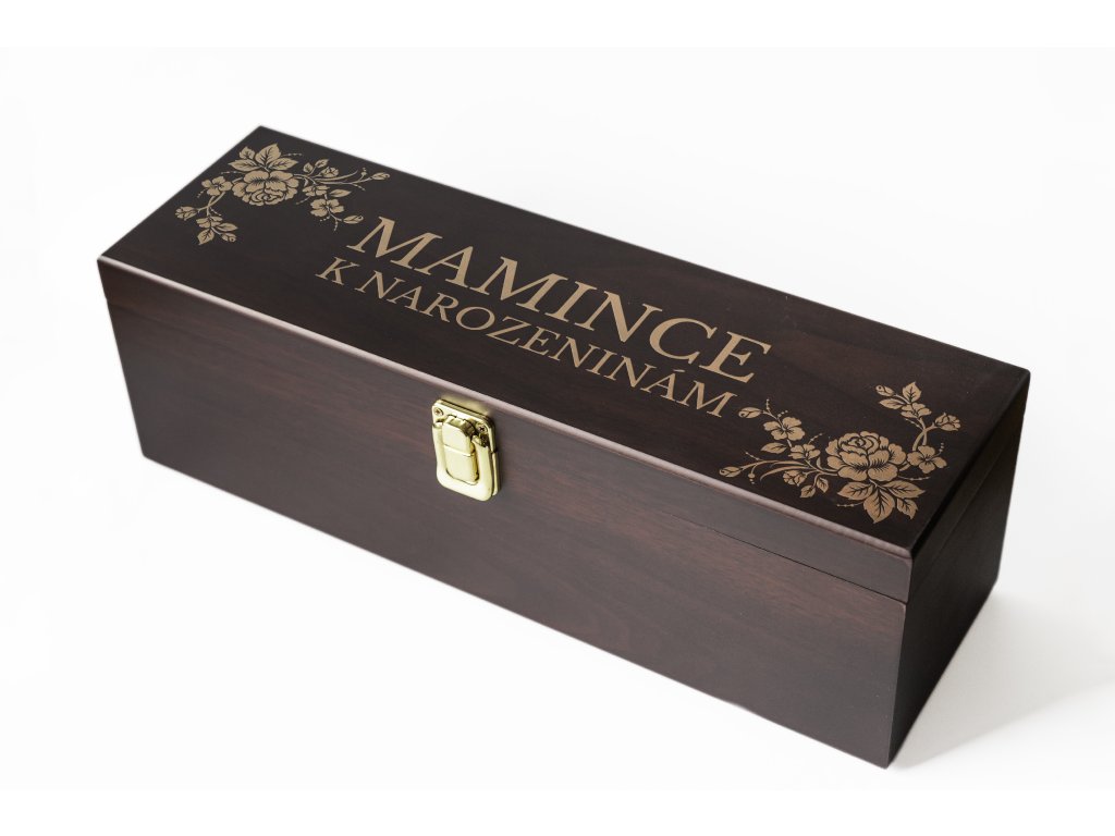 Dřevěný dárkový polstrovaný box na víno je vybaven příslušenstvím - obsahuje číšnický nůž, ochranný kroužek na láhve, nálevku a zátku s dřevěným úchopem. Vyobrazená láhev není součástí balení.
