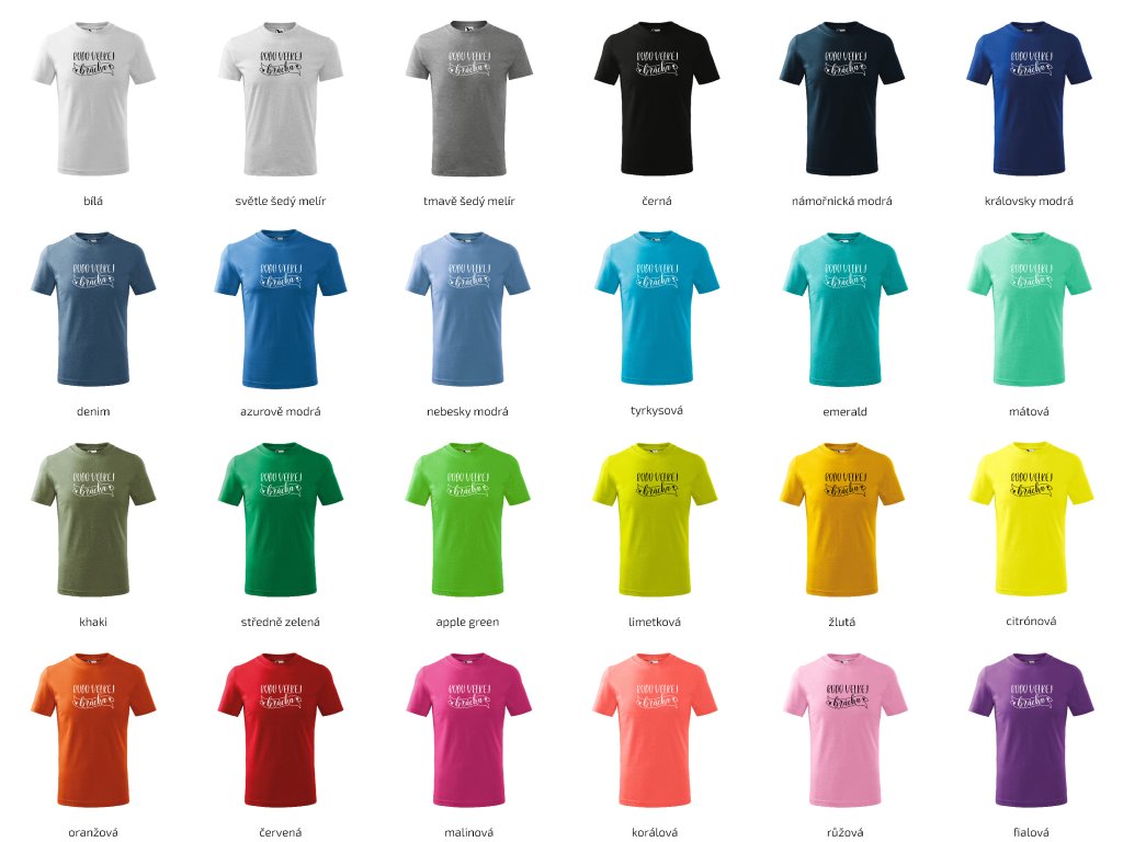 Tričko nabízíme v široké škále barev: bílá, světle šedý melír, tmavě šedý melír, černá, námořnická modrá, královsky modrá, denim, azurově modrá, nebesky modrá, tyrkysová, emerald, mátová, khaki, středně zelená, apple green, limetková, žlutá, citrónová, oranžová, červená, malinová, korálová, růžová a fialová.