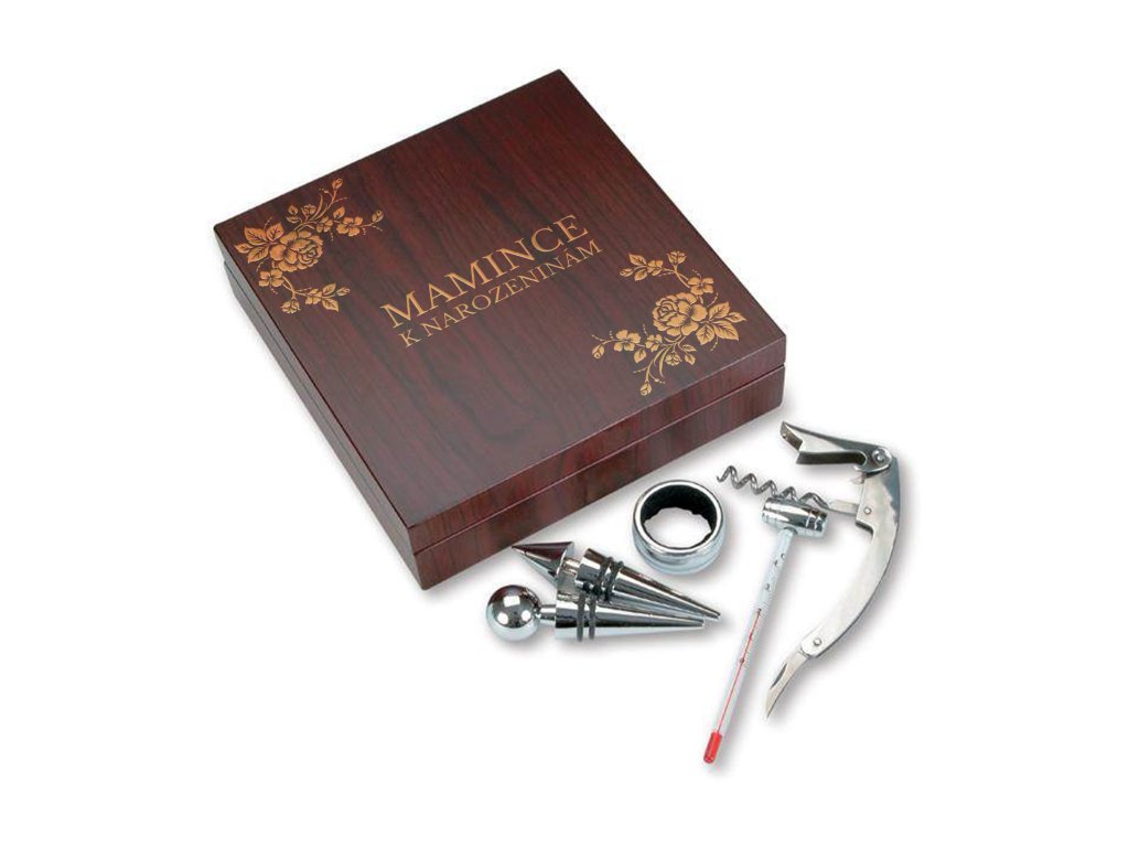 Pětidílná dárková sada na víno obsahuje kovový otvírák s vývrtkou a nožíkem, kroužek na hrdlo, teploměr a dvě zátky s odlišně tvarovanými kovovými úchyty. Vše je uloženo v dřevěném polstrovaném boxu s uzavíráním na magnety.