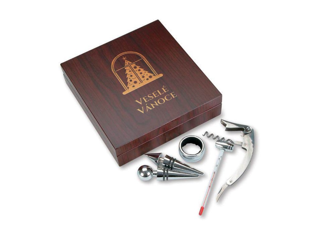 Pětidílná dárková sada na víno obsahuje kovový otvírák s vývrtkou a nožíkem, kroužek na hrdlo, teploměr a dvě zátky s odlišně tvarovanými kovovými úchyty. Vše je uloženo v dřevěném polstrovaném boxu s uzavíráním na magnety.