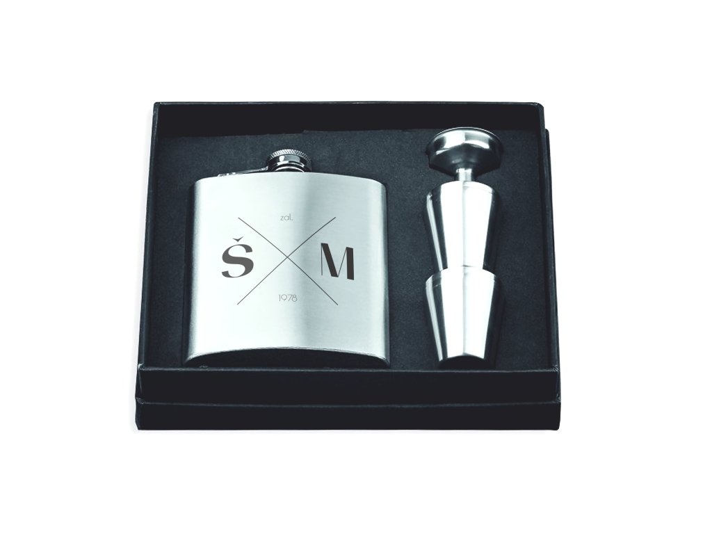 Dárková sada nerezová butylka s pohárky – monogram „Š × M“ s rokem založení 🥂