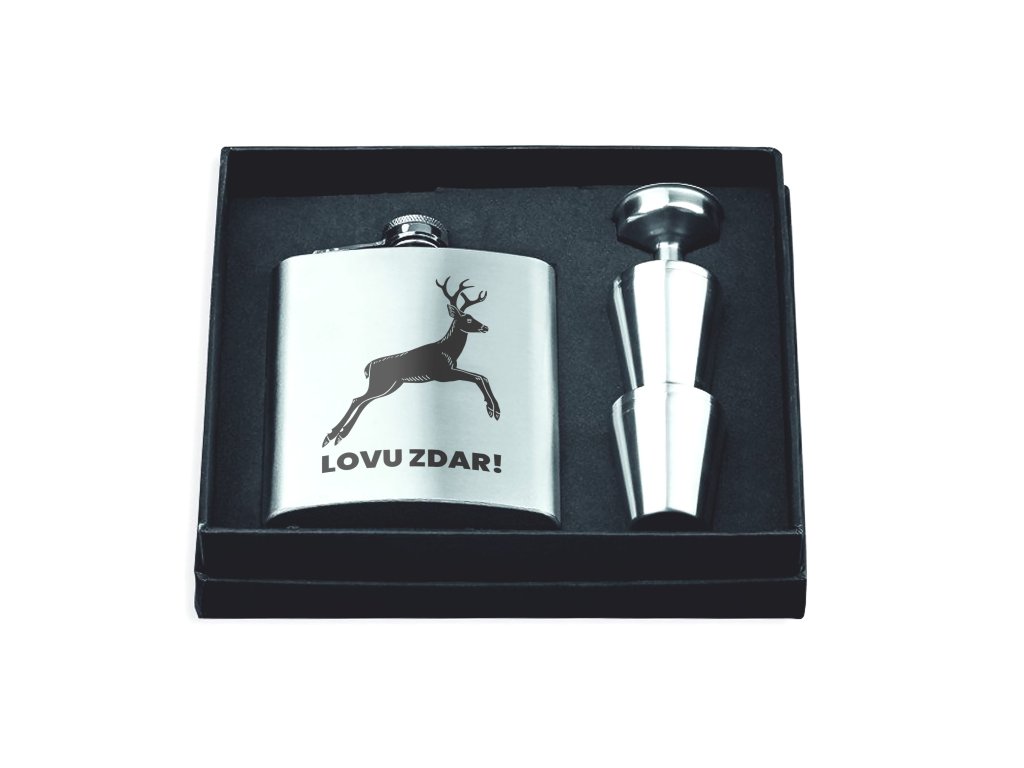 Dárková sada nerezová butylka s pohárky – „Lovu zdar!“ 🦌🥃