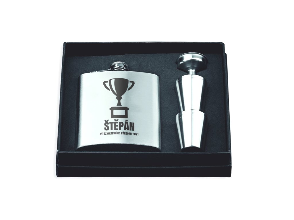 Dárková sada nerezová butylka s pohárky – Vítěz s pohárem 🏆 (jméno na přání)