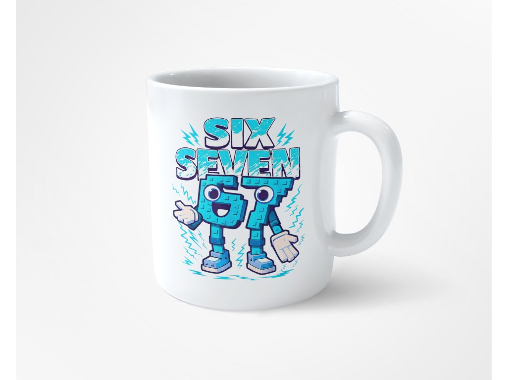 Bílý hrníček s výrazným barevným potiskem „Six Seven“.