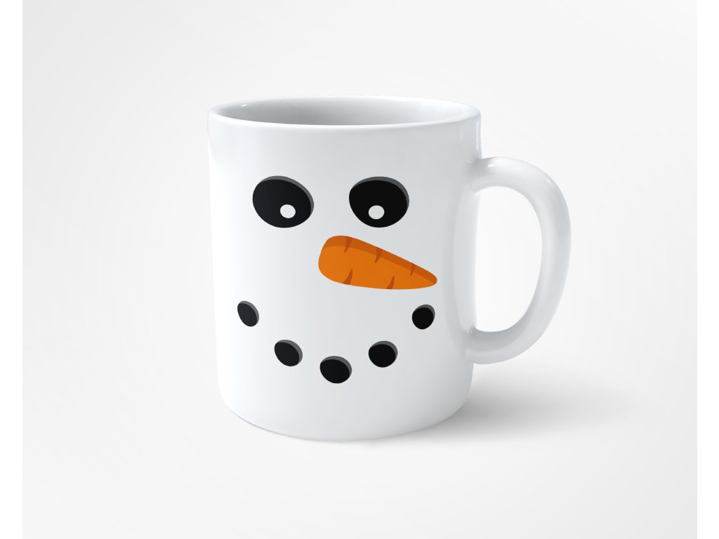 Bílý hrnek s motivem sněhuláka – černé oči, úsměv z uhlíků a oranžový nos ve tvaru mrkve.