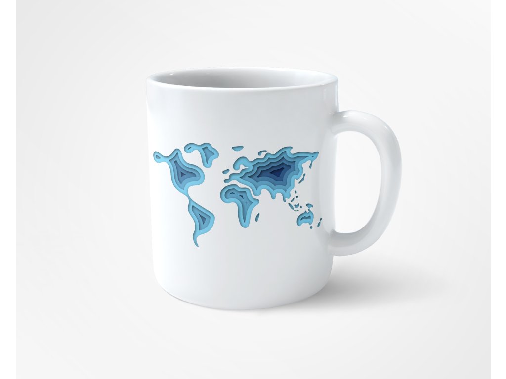 Bílý hrnek s modrým motivem mapy světa ve stylovém vrstveném designu.