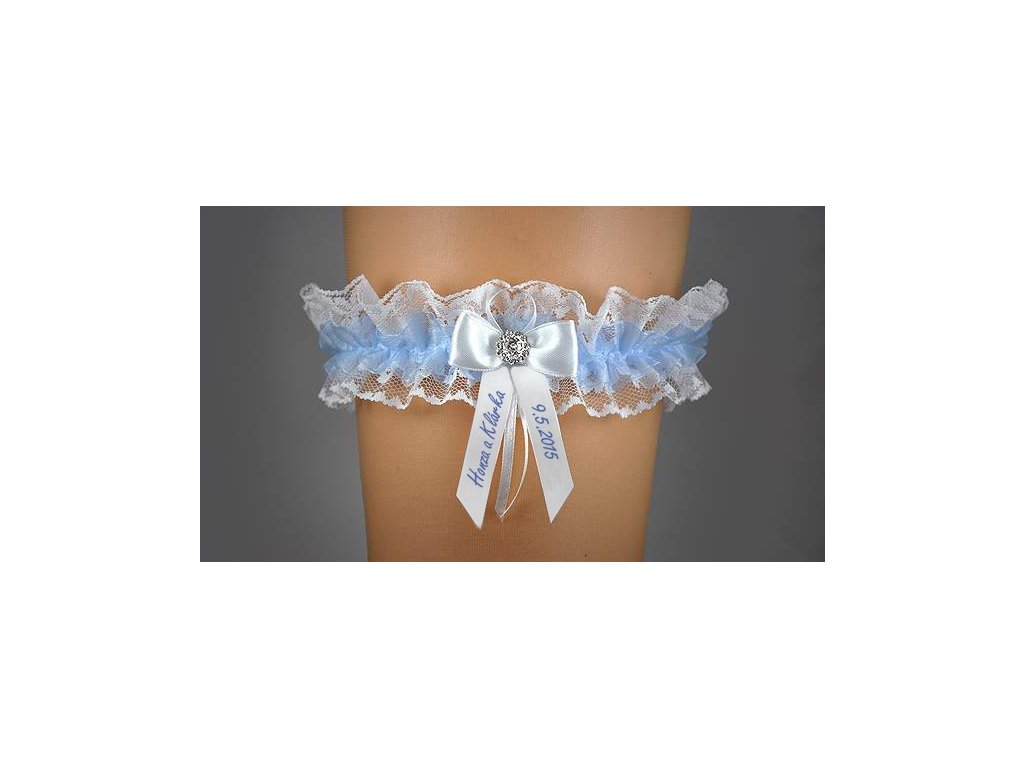 💎 Svatební podvazek s modrou krajkou, mašlí a potiskem jmen
