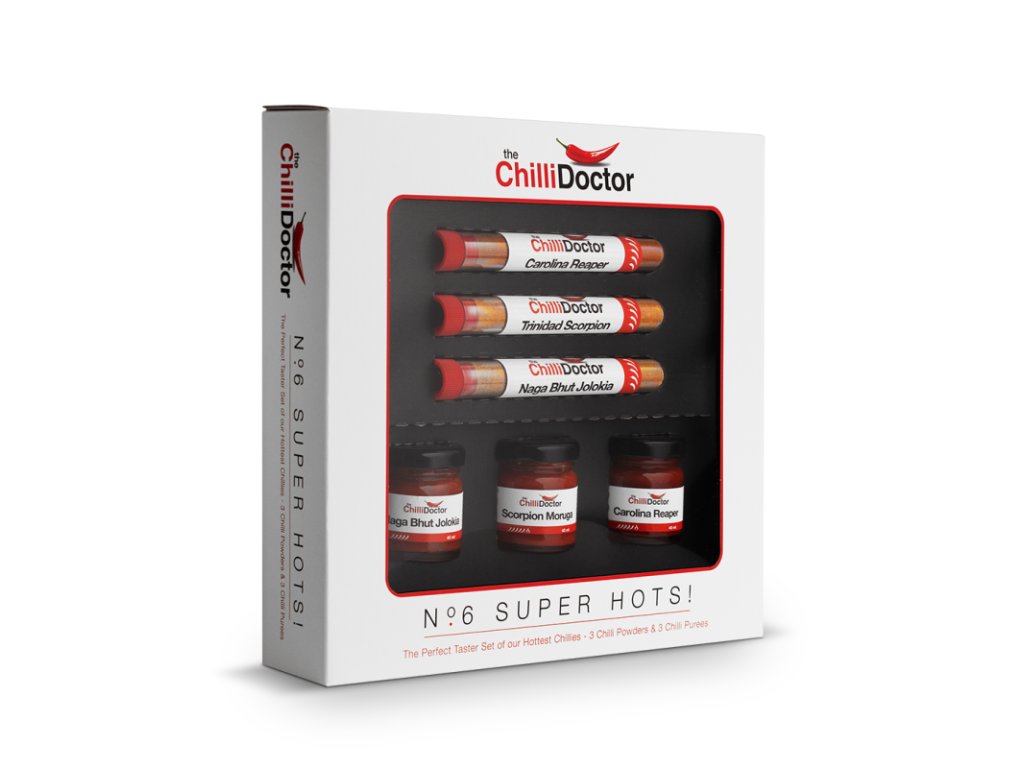 Dárková sada pro odvážné, obsahující tři nejpálivější chilli papričky na světě ve formě prášků i tekutého pyré. Sada obsahuje jedinečný výběr chilli papriček Naga Bhut Jolokia, Trinidad Scorpion a Carolina Reaper. Díky endorfinům, které se vám po spalujícím žáru vyplaví, je tenhle balíček navíc plný radosti!